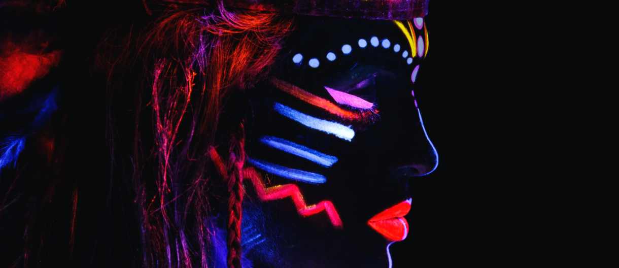 Maquiagem para festas e luz negra. Sugere-se realizar com os educandos um momento de estudo e prática sobre o tema. Você pode buscar inspiração apresentando alguns artistas como referência para seus educandos, como Jordan Hanz, por exemplo: Glam Galaxy Cat Halloween Makeup Tutorial | Jordan Hanz (youtube.com)