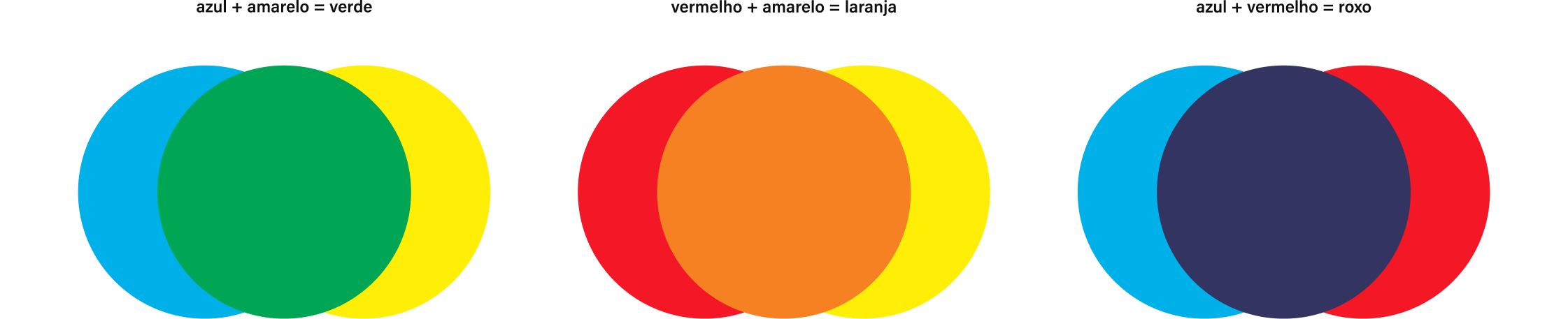 O azul misturado com o amarelo origina o verde. O azul misturado com o vermelho origina o roxo, e o vermelho misturado com o amarelo origina o laranja.