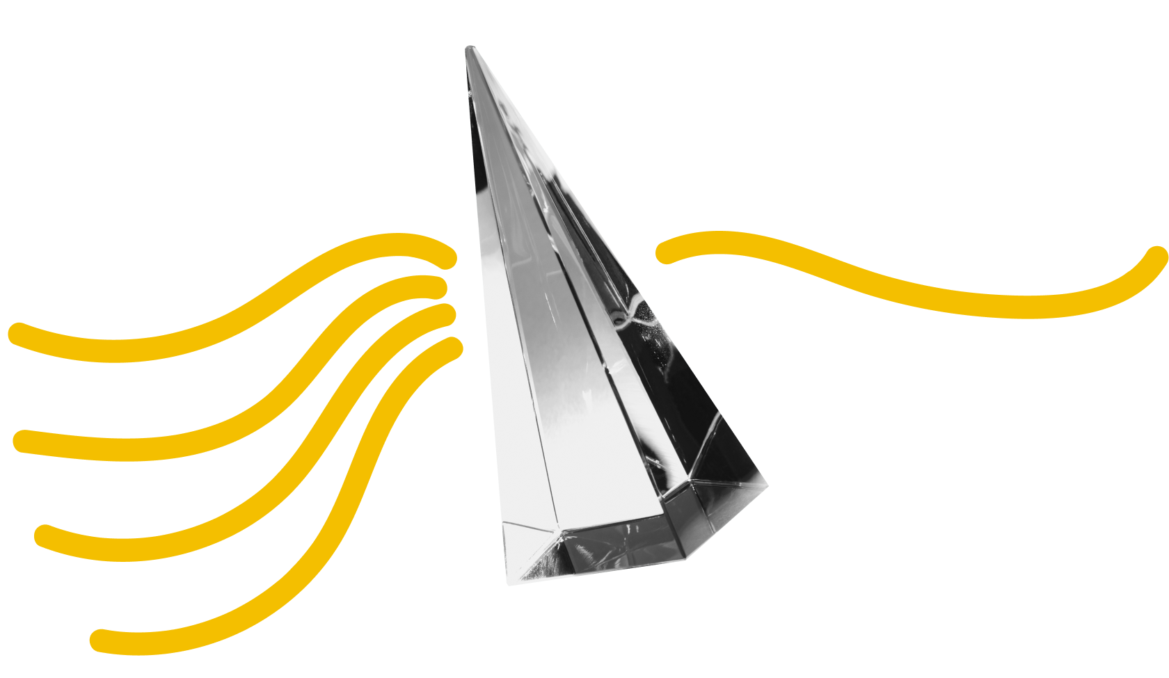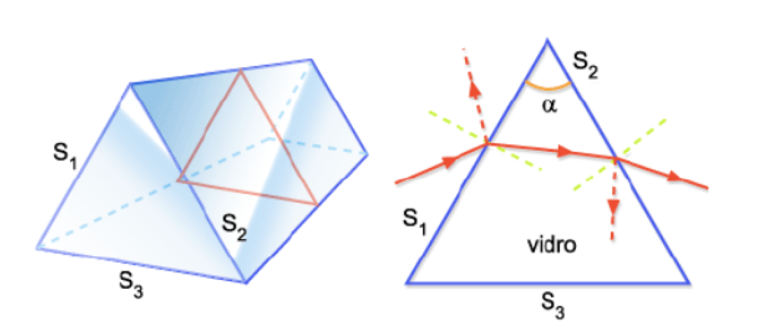 O prisma é um material transparente e homogêneo com duas faces laterais lisas e inclinadas indicando um triângulo.