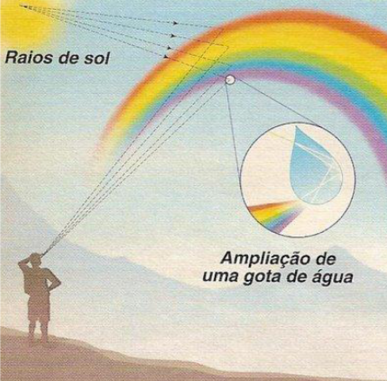 Dispersão de luz – Este fenômeno promove a separação de uma onda luminosa em vários componentes. Relembre com seus educandos a pesquisa realizada anteriormente sobre Luz monocromática e policromática com intuito de conduzi-los à compreensão do que acontece para que um arco-íris apareça.