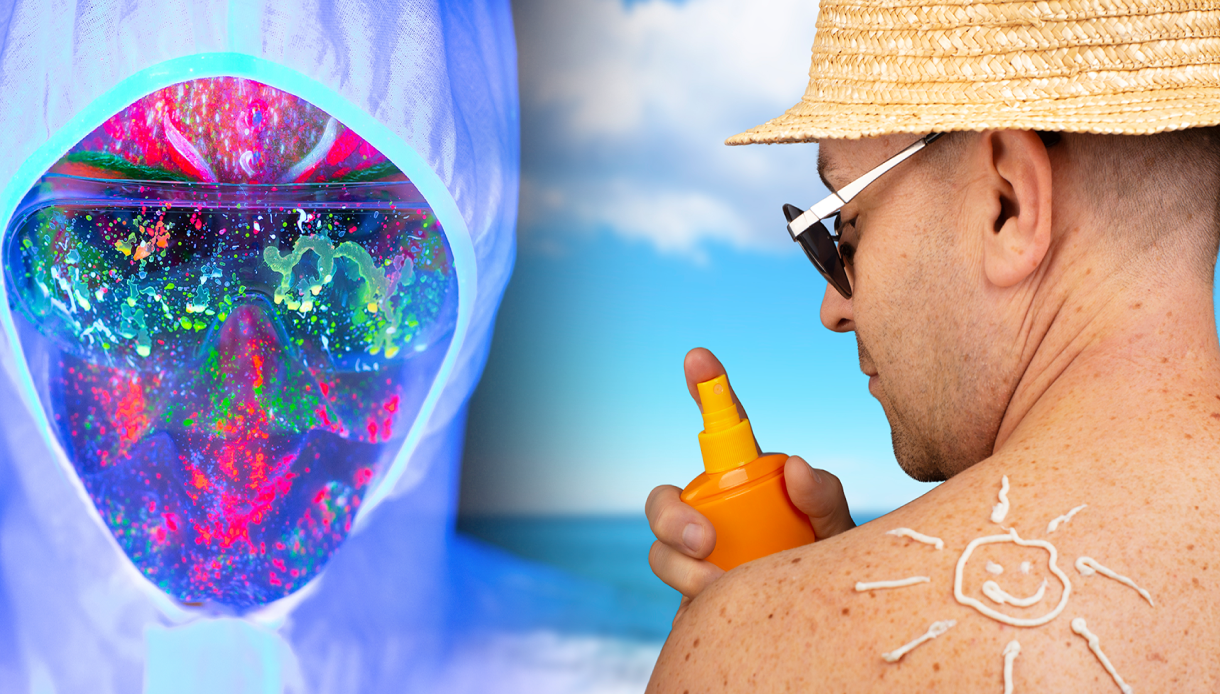 Os protetores solares possuem, dentre outras, uma substância responsável por absorver os raios ultravioletas chamada Dióxido de Titânio, extraída do mineral titanita. Neste vídeo, o protetor solar é usado como tinta invisível, pois só aparece quando é exposto à uma lâmpada de luz negra, ou UV.